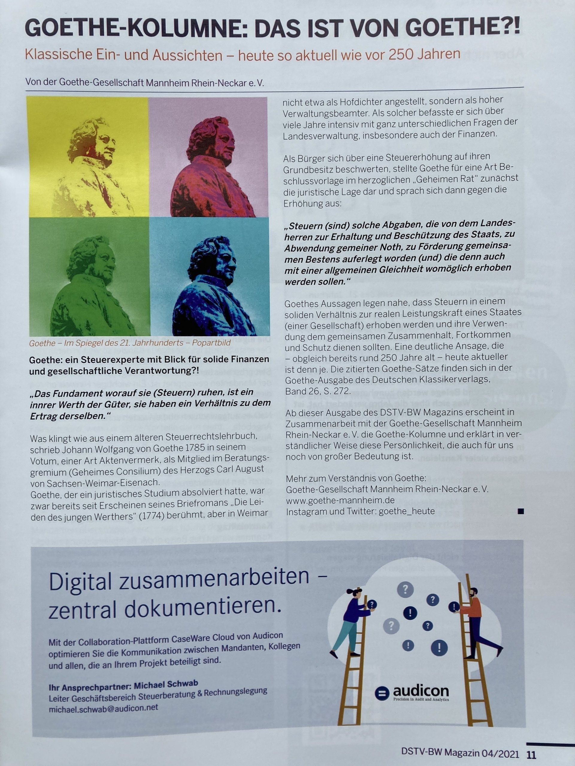 In Zusammenarbeit mit dem DSTV-BW (Landesverband der steuerberatenden und wirtschaftsprüfenden Berufe Baden-Württemberg e. V) entsteht seit Dezember 2021 in jedem Quartal eine "Goethe-Kolumne".